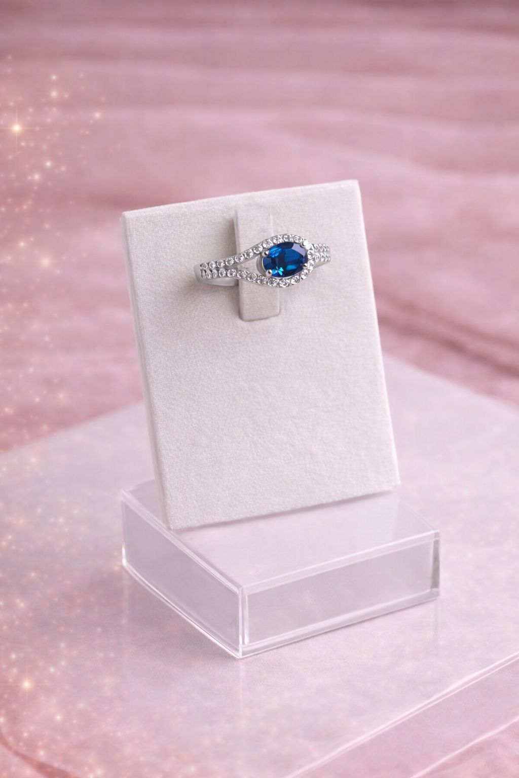 Anel de prata com pedra de Zircônia Safira Azul e detalhes em pedras de Zircônia Branca translúcida. Antialérgico, com excelente acabamento e 1 ano de garantia.