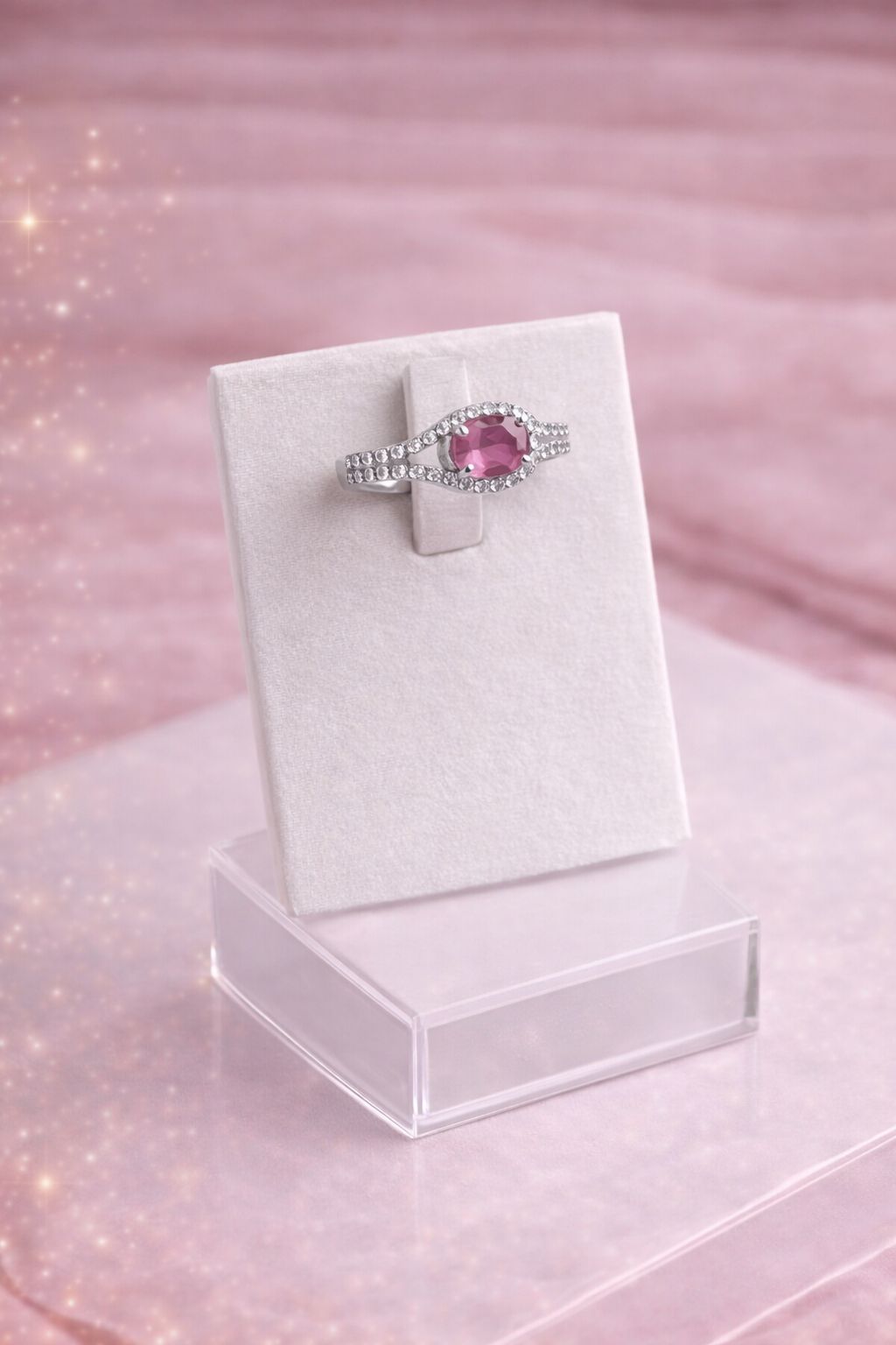 Anel de prata com pedra de Zircônia Turmalina Rosa e detalhes em pedras de Zircônia Branca translúcida. Antialérgico, com excelente acabamento e 1 ano de garantia.