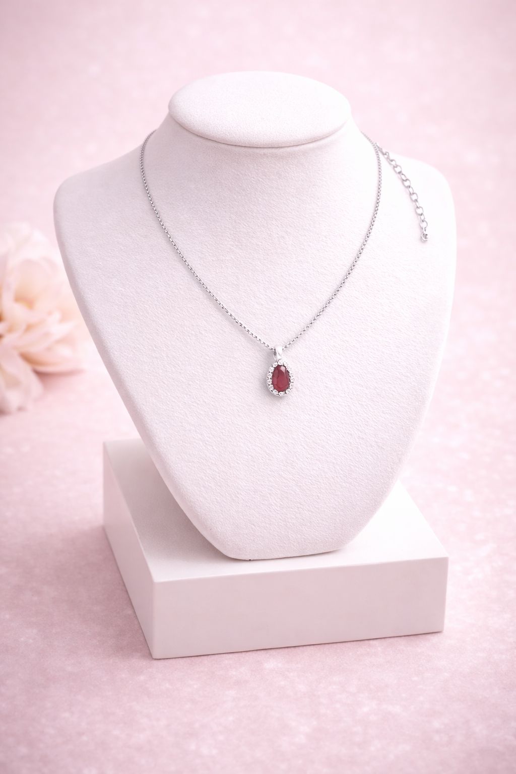 Colar de prata com pingente de pedra de Zircônia Rubi e detalhes em pedras de Zircônia Brancas translúcidas. Antialérgico, com excelente acabamento e 1 ano de garantia.