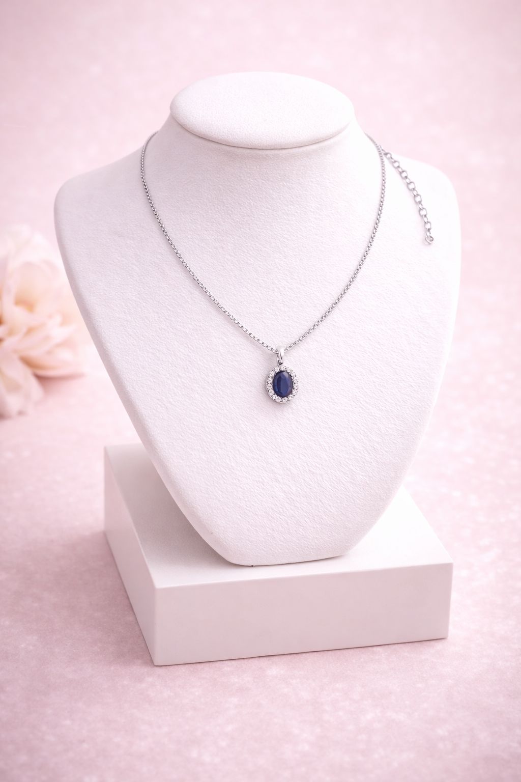 Colar de prata com pingente em pedra de Zircônia Azul Safira e detalhes em pedras de Zircônia Branca translúcida. Antialérgico, com excelente acabamento e 1 ano de garantia.
