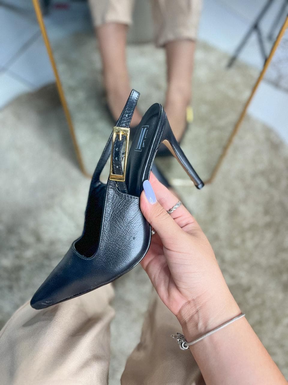 Sapato feminino confeccionada em couro, modelo salto , possui bico fino em formato de folha, calçado elegante e sofisticado . Semiaberta, possui tiras em torno do calcanhar com fechamento em fivela metálica. O modelo minimalista e conceituado que cria um aspecto elegante em diversas ocasiões, desde eventos formais até o uso cotidiano.